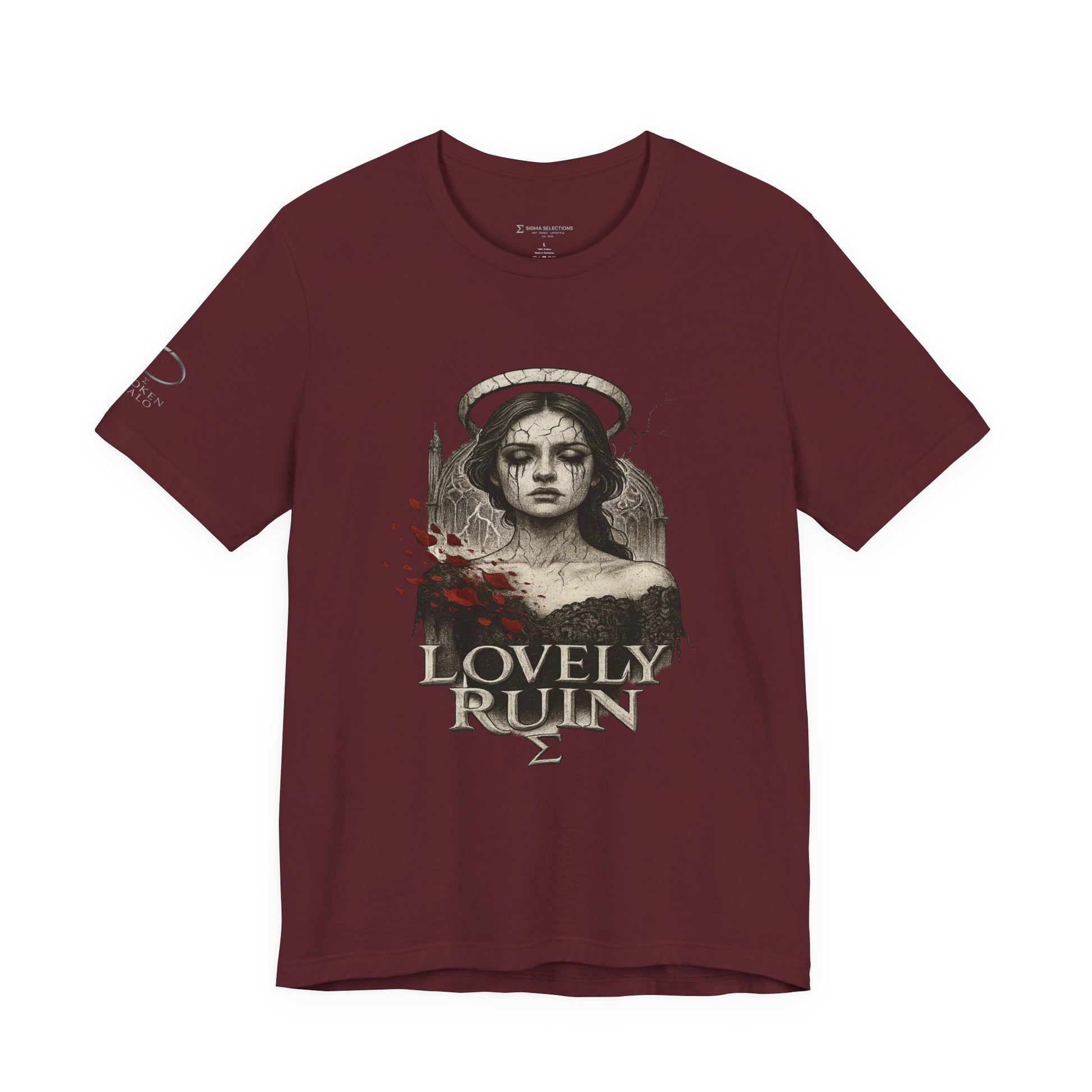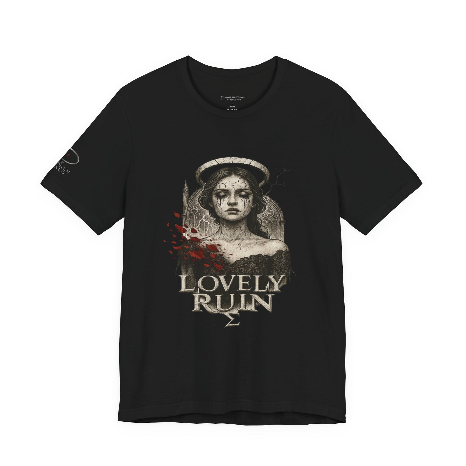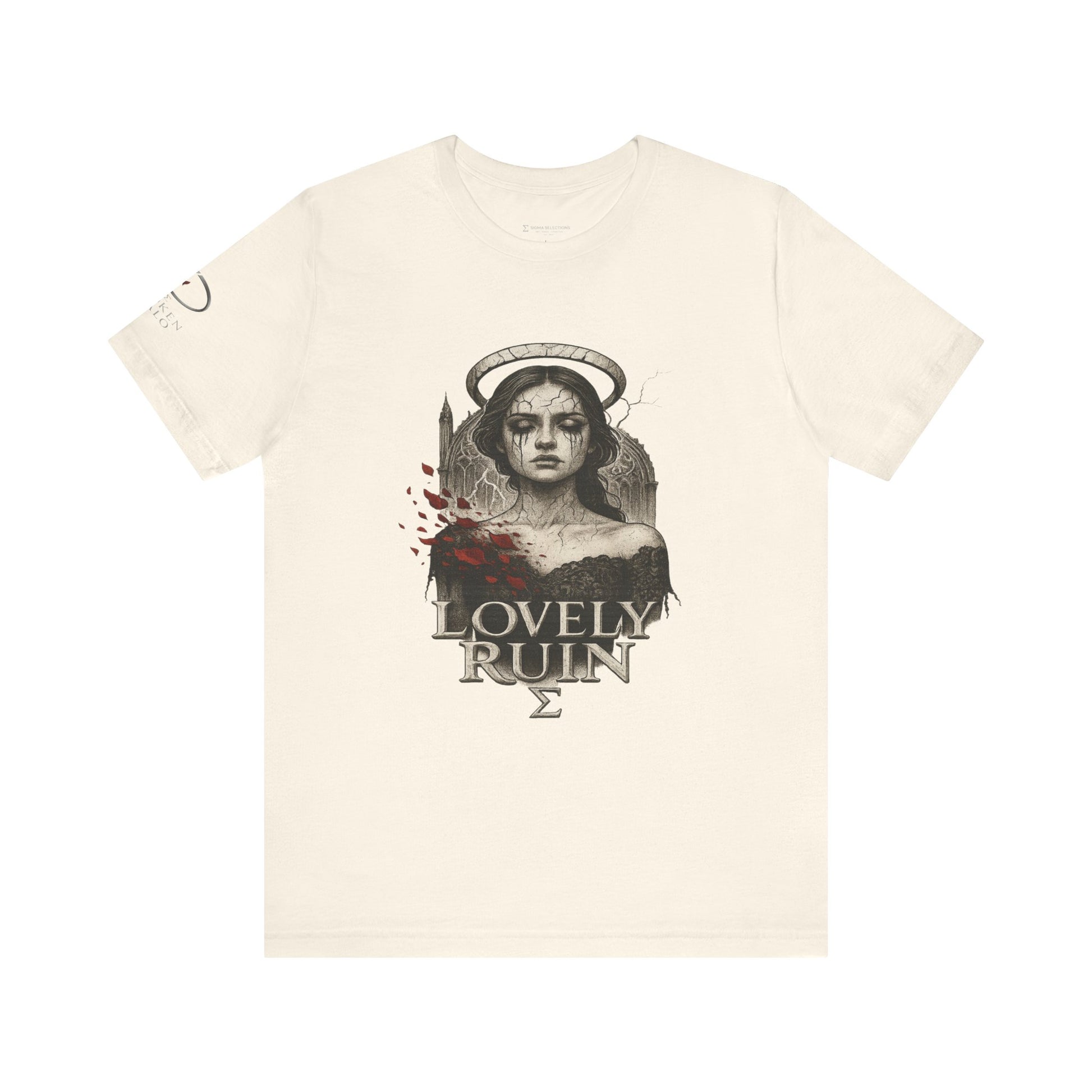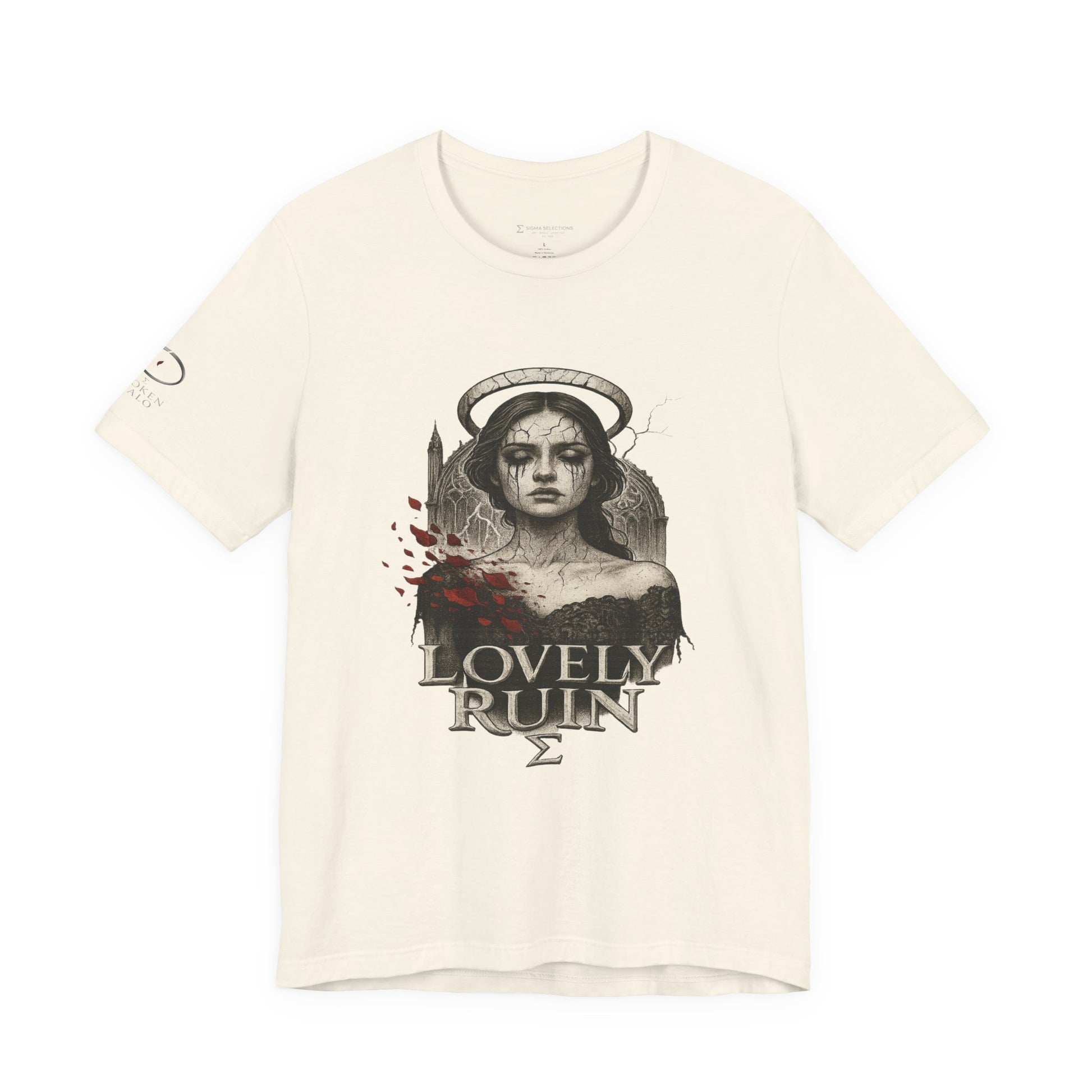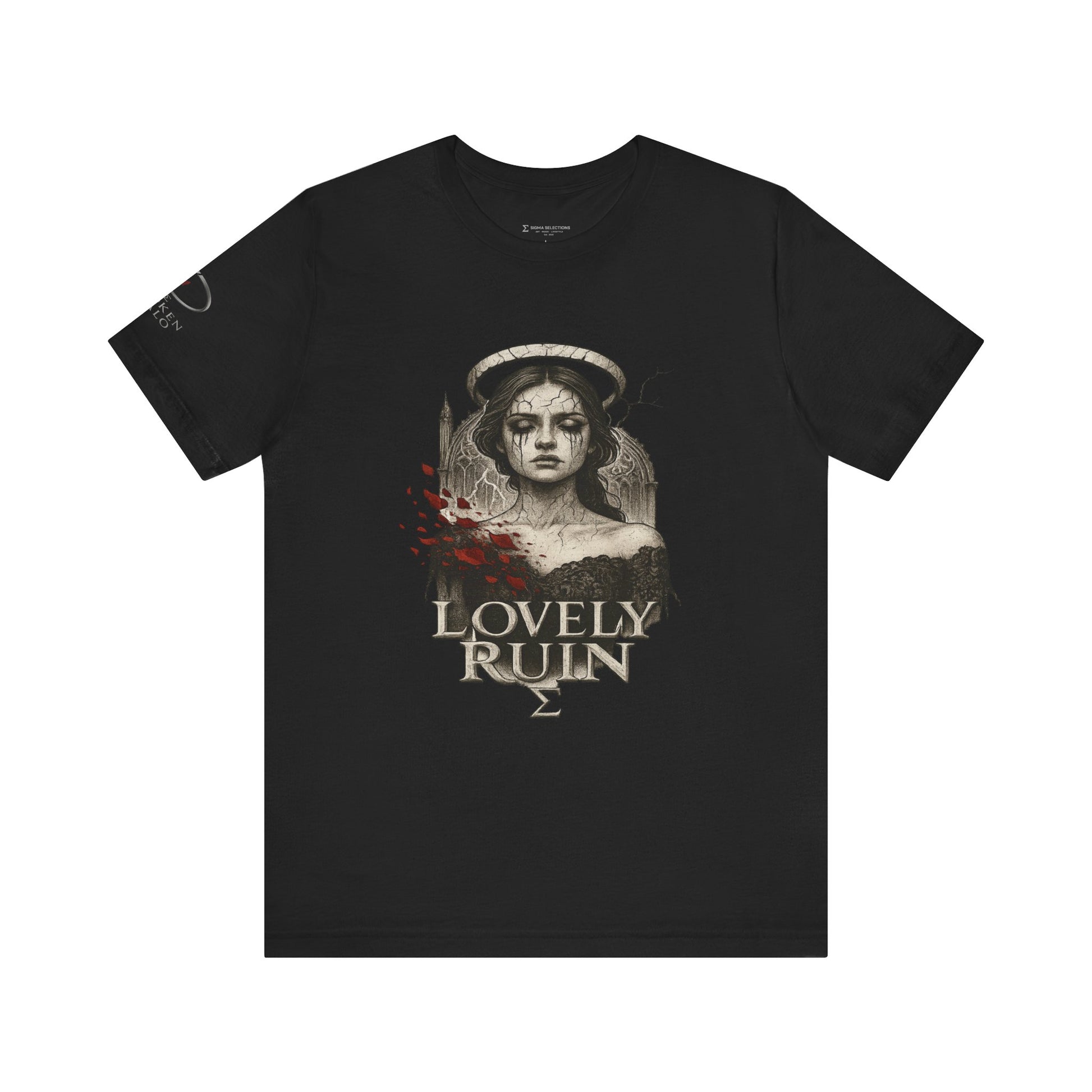 The Lovely Ruin Tee captures that haunting line between heartbreak and elegance. A fractured halo glows above a figure touched by both light and loss, surrounded by fading crimson petals that refuse to die quietly. Every detail speaks of resilience dressed as art.
