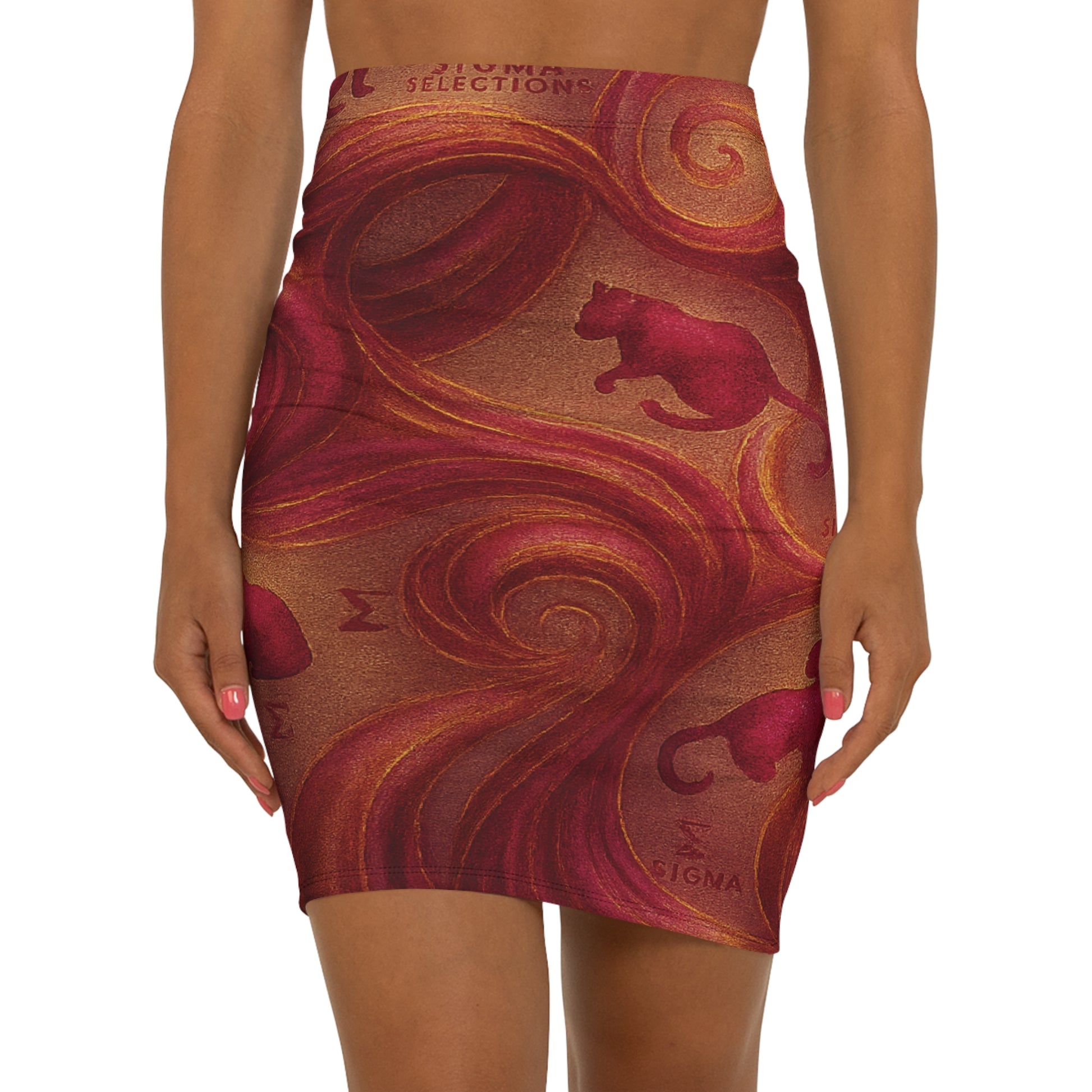 The Velvet Inferno Skirt is a living ember — deep golds and reds swirling in motion, crowned by the faint silhouette of a panther stalking through molten fabric. Designed to sculpt, not squeeze, it hugs every curve while giving the kind of confidence that doesn’t ask for validation.